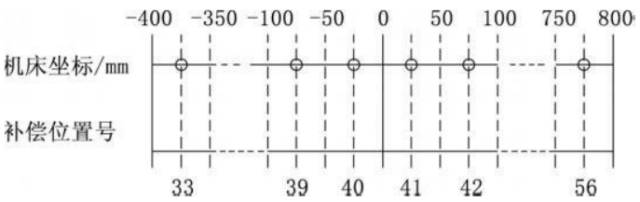 负方向最远的补偿号位置为:参考点的补偿位置号-负方向的机床行程/补偿位置间隔+1=40-400/50+1=33;正方向最远的补偿号位置为:参考点的补偿位置号+正方向的机床行程/补偿位置间隔=40+800/50=56。