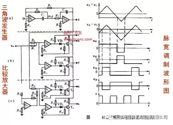 三角波电压uΔ与速度控制指令电压uer比较后送入运算放大器。运算放大器输出电压的频率与基准三角波电压的频率一致,输出电压的脉冲宽度取决于速度控制指令电压uer。可见运算放大器的输出是一个脉宽调制波,经放大后与主回路四个功率开关管的基极相接。