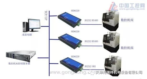 为了更好的解决数控机床自动化问题,我司提供了数控机床联网的解决方案,利用我们自行研发生产的SED6220系列串口服务器使车间里原本带有RS232/485的数控机床迅速链到带有TCP/IP协议的局域网中,工程师可在局域网的任何一个角落随时随地对数控机床进行数据操作,局域网的数据传输方式提高了系统的可靠性、易用性,降低了现场工作人员的技术要求,提高了工作效率,降低了工作成本,享受网络带来的无限便利。
