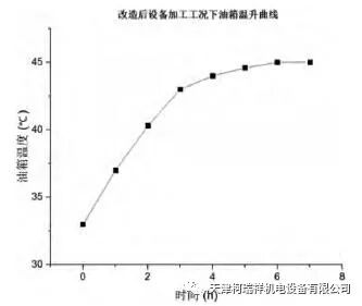 的流量下的当量冷却功率为 0.09k W/℃,满足要求;选择离心泵 TCP-118 作为冷却系统的循环泵,该泵的扬程为 12m。图 5 为改造后的设备在加工工况下的温升曲线。