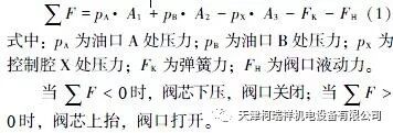 二通插装阀的驱动取决于压力。对阀的驱动, 有3 个重要的承压面积A1、A2 、A3 , A1 为阀座的面积, A3 为弹簧腔控制油作用面积, A2 为环形面积, A2 =A3 -A1 。其中: 面积A1 和A2 的液压油压力作用在阀开启方向, 面积A3 的控制油压力和弹簧力作用在阀关闭方向, 合成力的有效方向(开启力或关闭力)决定了二通插装阀的开关状态[2-3] 。
